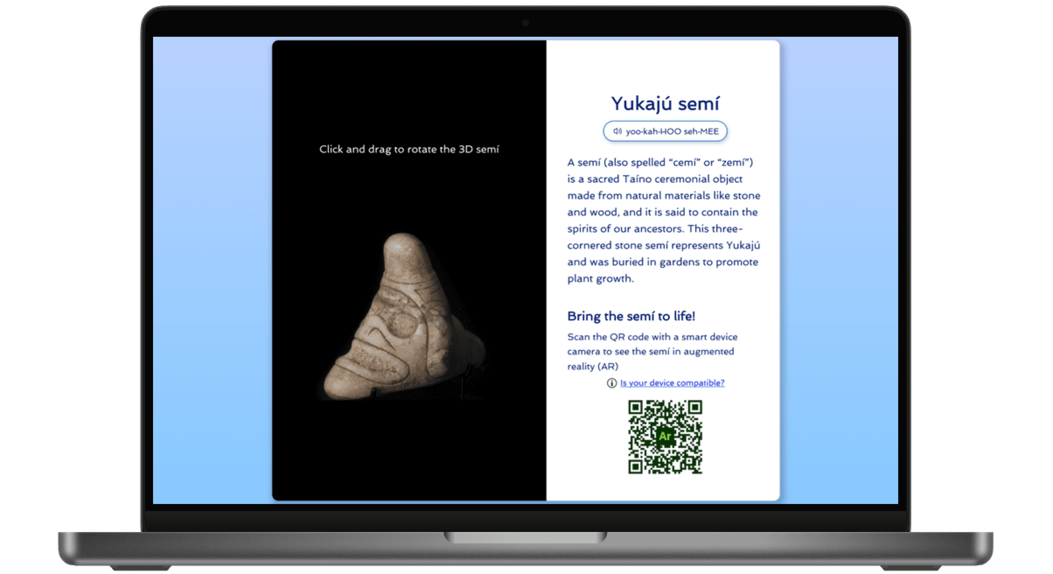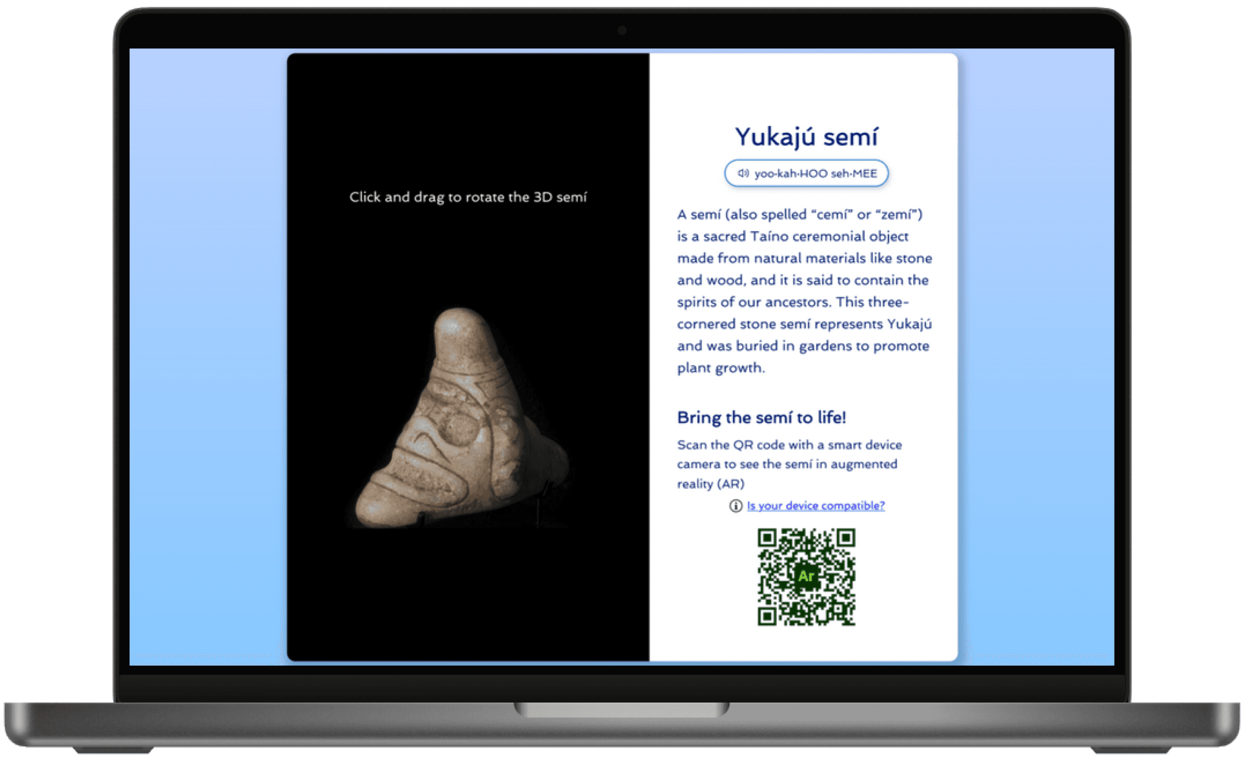Client requested a new design spec of adding an augmented reality (AR) component via QR code to the design, allowing users to view and place the 3D artifact in their real environment via their mobile device.